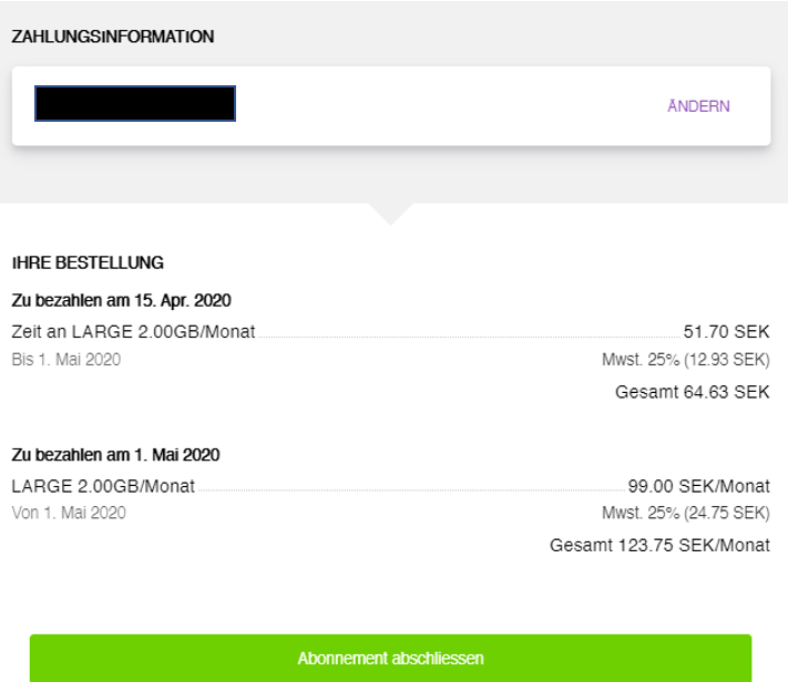 Klicken Sie auf “Weiter zur Zahlung” und geben Sie Ihre Zahlungsinformationen ein und klicken Sie dann auf „Abonnement abschliessen“.