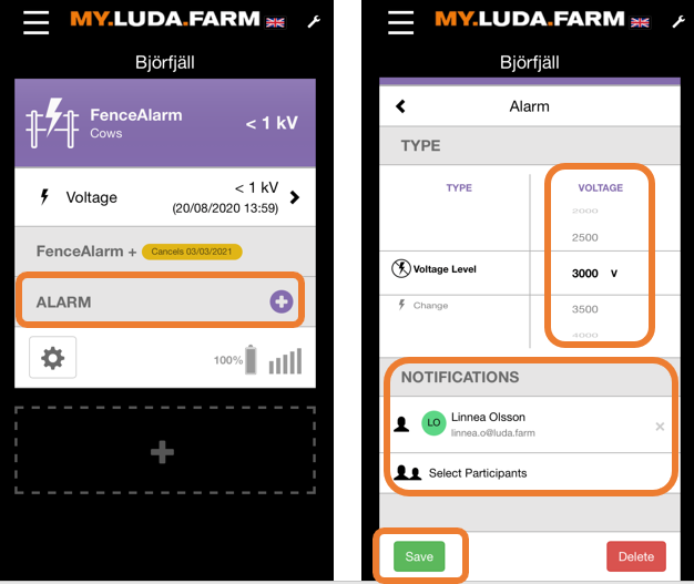 6. För att lägga till ytterligare deltagare av alarm-notifieringar välj "deltagare" och välj i listan över gårdens medlemmar vilka som ska få notifieringar.
